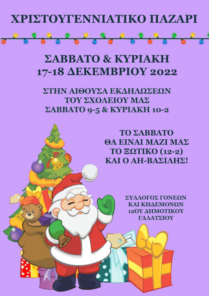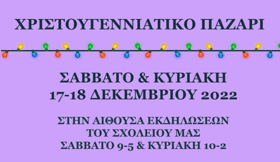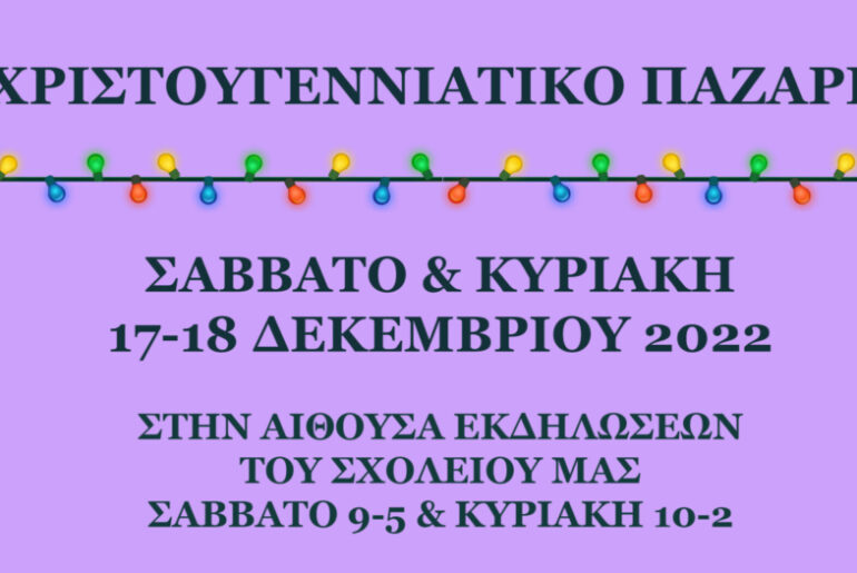 Αγαπητοί γονείς και κηδεμόνες, με μεγάλη χαρά σας προσκαλούμε στο χριστουγεννιάτικο παζάρι του σχολείου μας, που φέτος θα πραγματοποιηθεί το Σαββατοκύριακο 17-18 Δεκεμβρίου στην Αίθουσα Εκδηλώσεων του σχολείου μας.